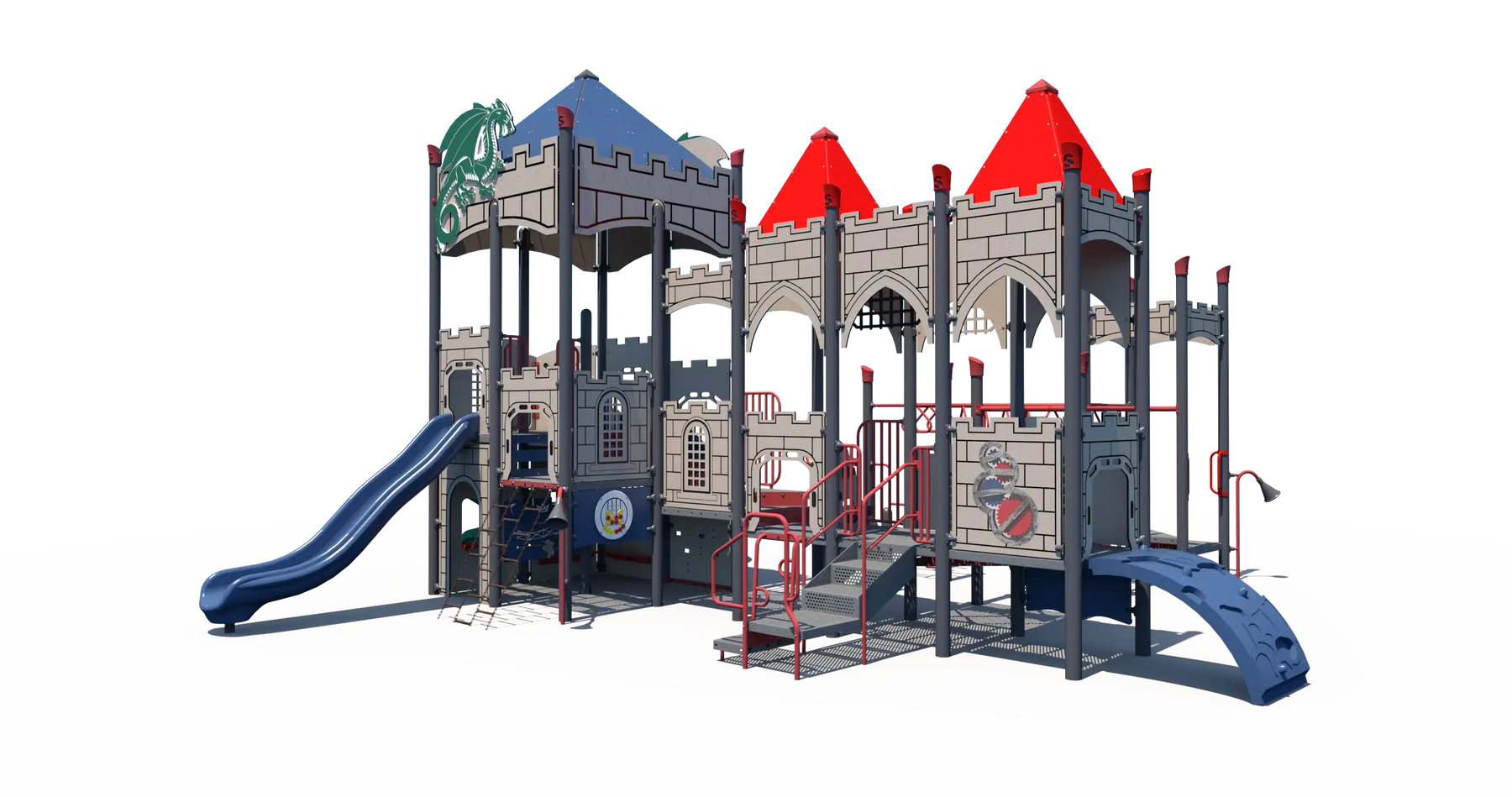 Castle-style walls and dragon-themed details create an immersive environment that encourages role play and imaginative exploration. Children can navigate a variety of climbers, slides, and interactive play panels, helping build strength, balance, and coordination while keeping them engaged in active outdoor play. Multiple play paths allow kids to explore different routes throughout the structure, promoting problem-solving and cooperative play with friends.