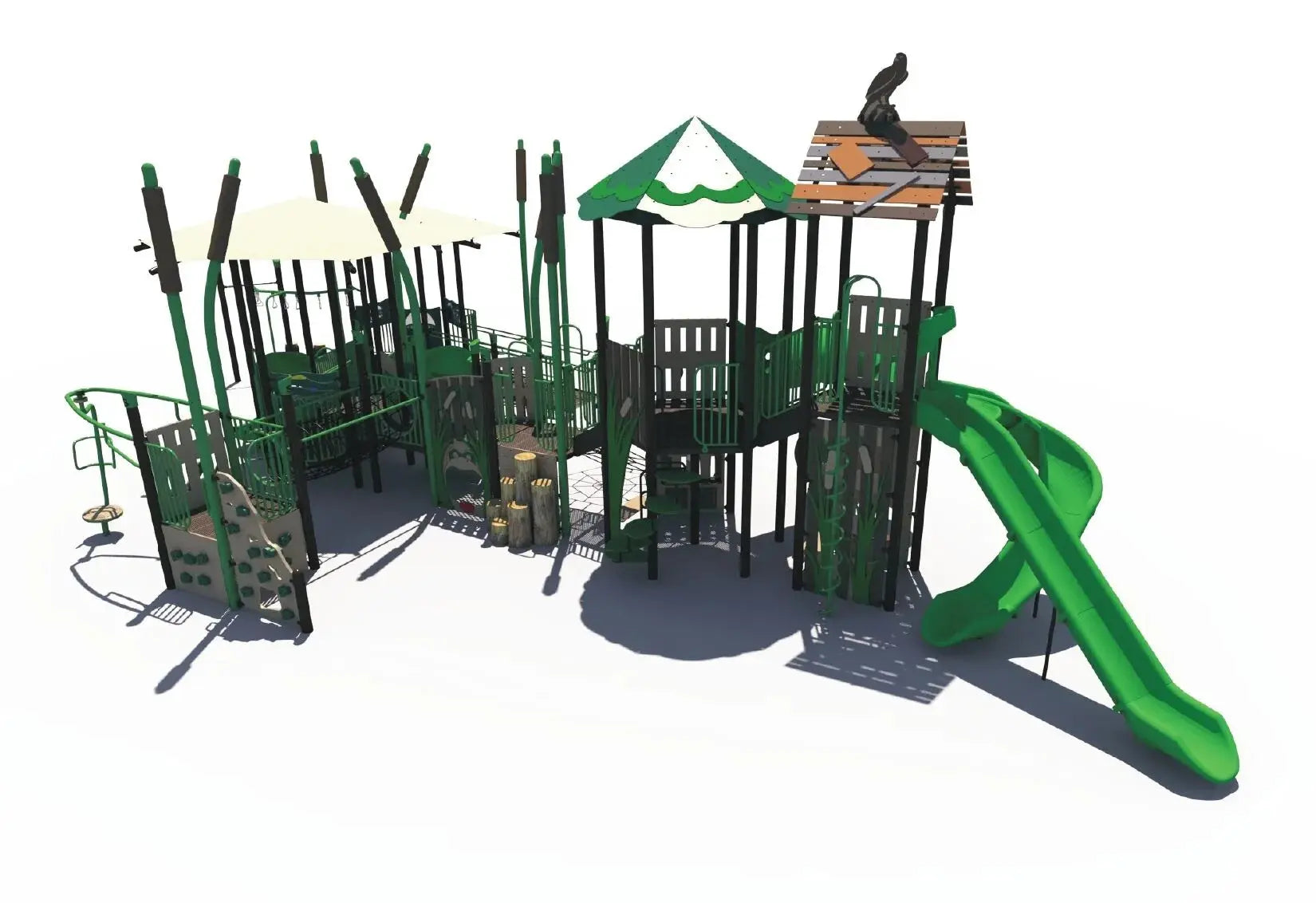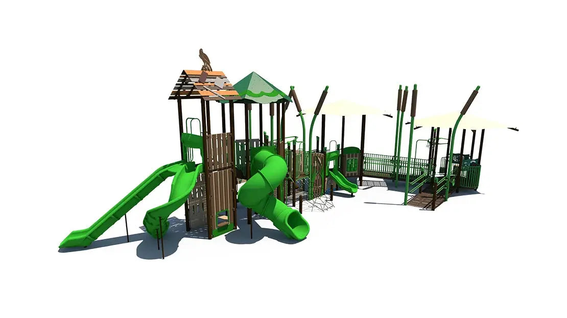 The marsh theme adds a natural, adventurous atmosphere while children climb, slide, and explore a variety of challenging play elements. Climbers and elevated pathways help build strength, coordination, and confidence, while interactive play panels encourage creativity, communication, and cooperative play. The large layout allows many children to play at once, making it ideal for high-traffic playground environments.