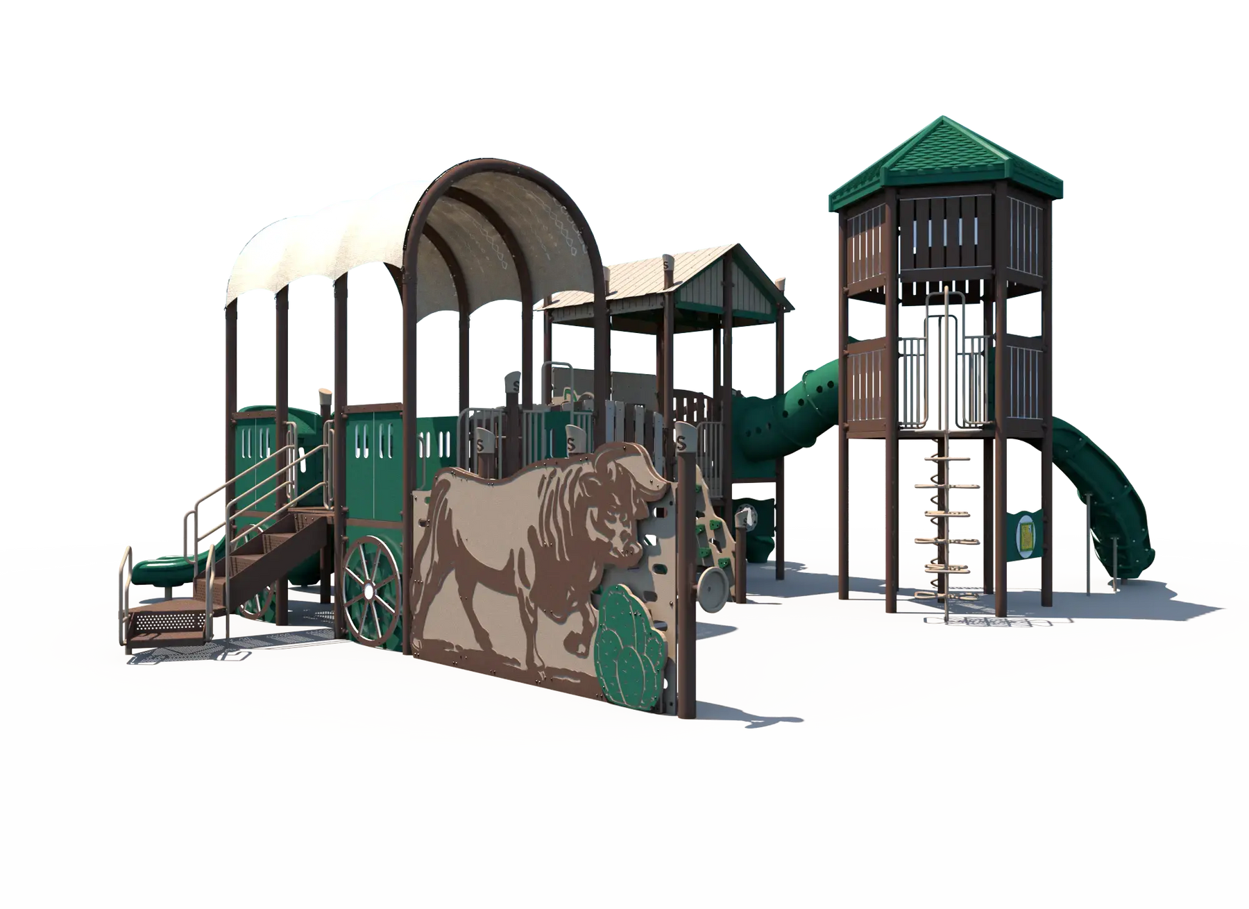 Inspired by the spirit of the Wild West, this playground encourages kids to create their own frontier adventures while exploring multiple play pathways throughout the structure. Children can build strength, balance, and coordination as they navigate climbers and elevated play areas, while exciting slides provide fast-paced movement play that encourages repeat exploration. Interactive panels add opportunities for imaginative role play and social interaction, helping children collaborate and create their own western town stories.