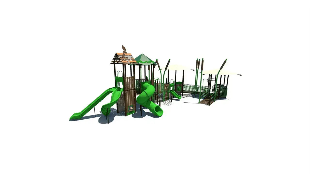 The marsh theme adds a natural, adventurous atmosphere while children climb, slide, and explore a variety of challenging play elements. Climbers and elevated pathways help build strength, coordination, and confidence, while interactive play panels encourage creativity, communication, and cooperative play. The large layout allows many children to play at once, making it ideal for high-traffic playground environments.
