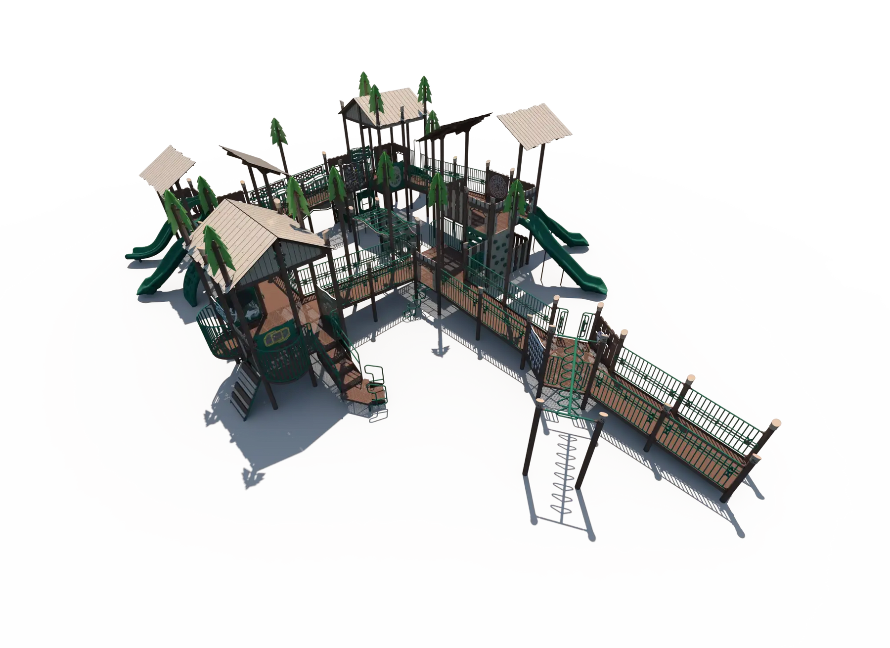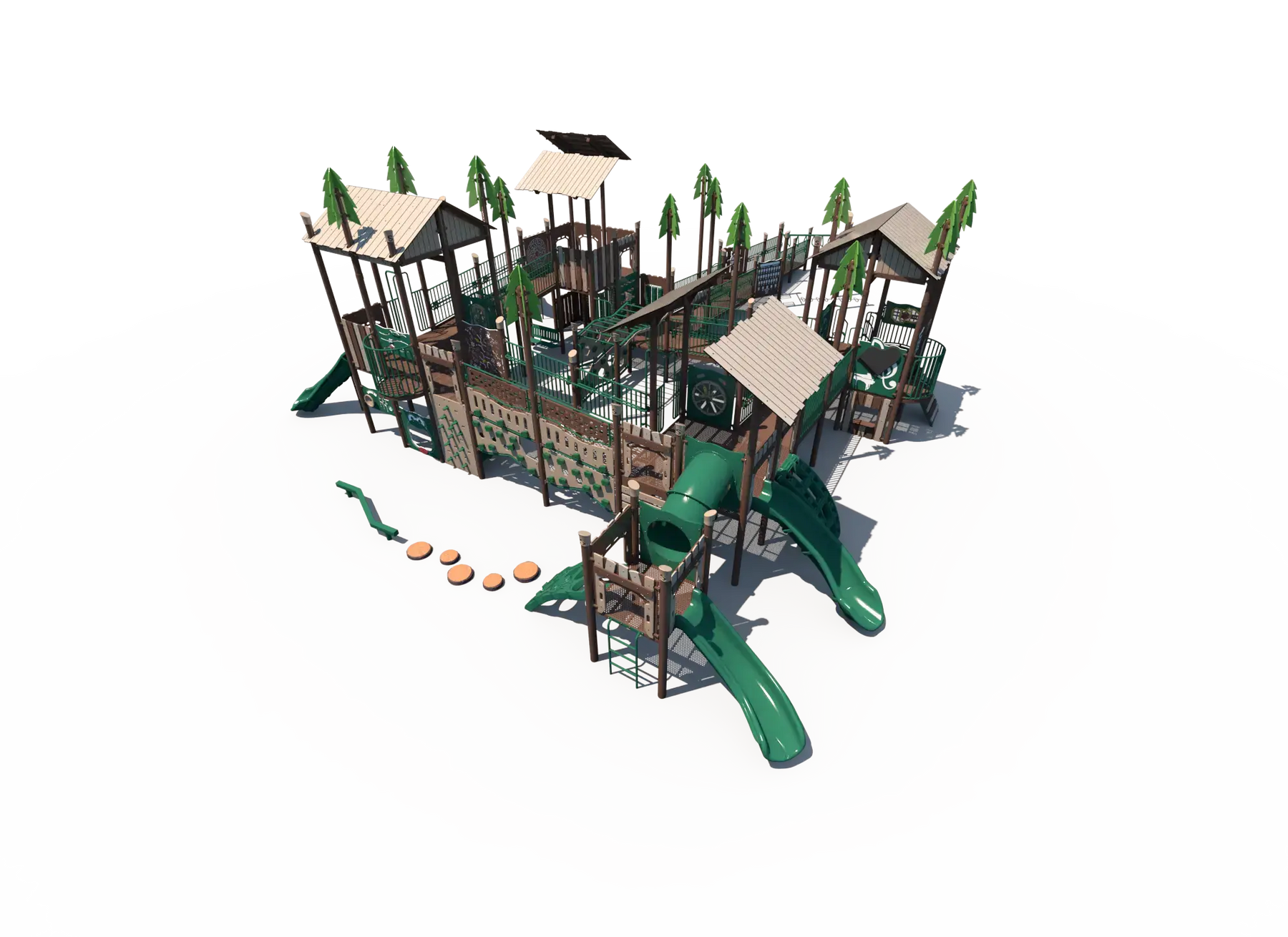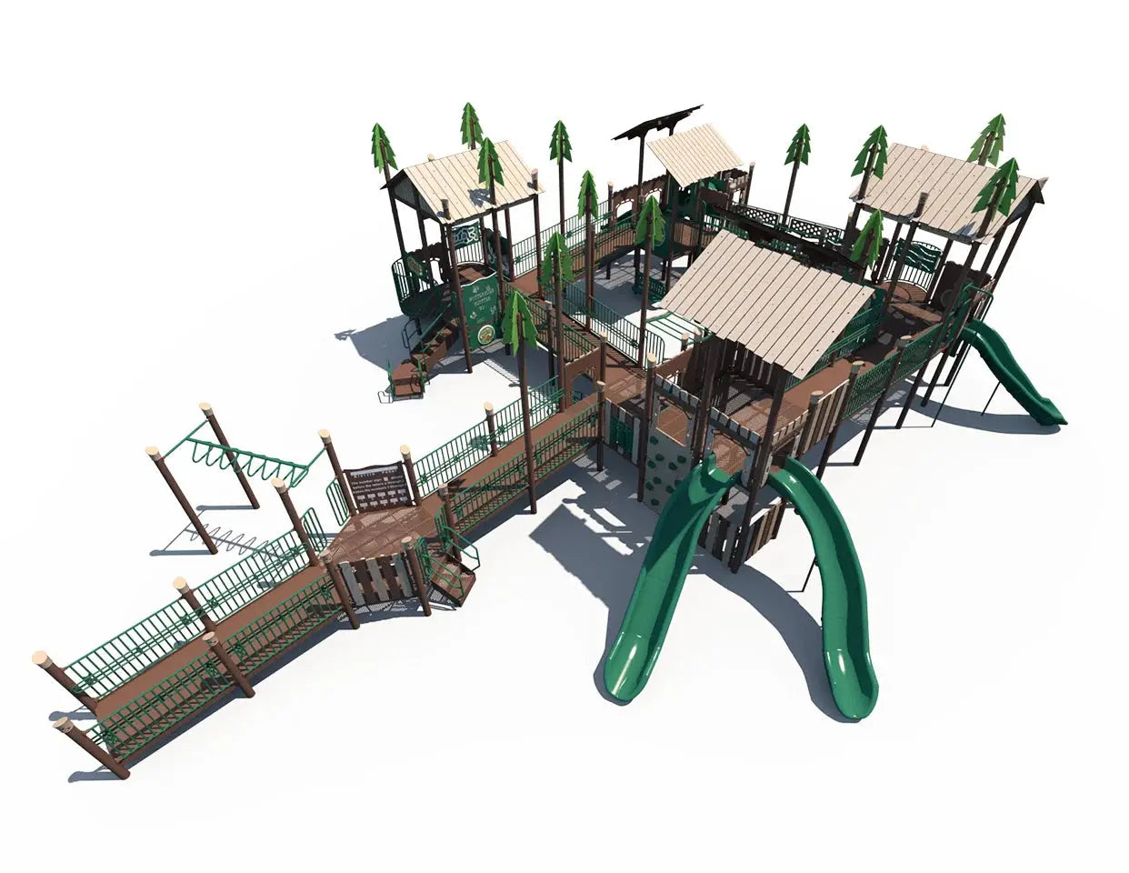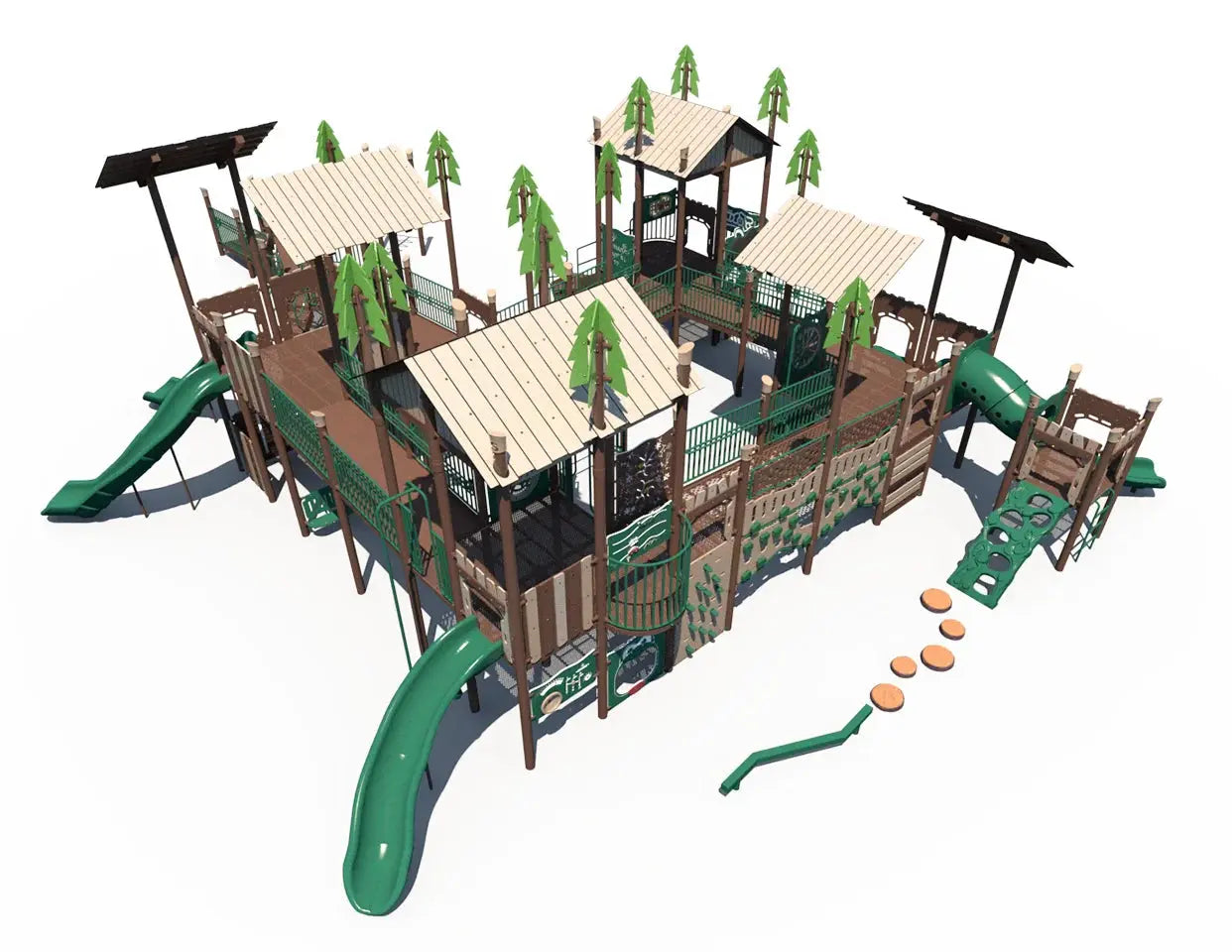Children can challenge themselves on a variety of climbers, slides, and elevated play paths, helping build strength, balance, coordination, and confidence. The nature-inspired theme adds visual interest while encouraging outdoor exploration and creativity. With multiple play zones and pathways, the structure keeps children engaged while supporting cooperative play and movement.