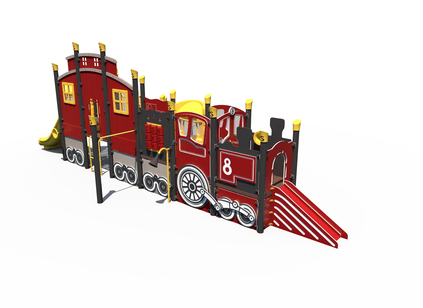 • Play Elements: Slides, Climbers, Activity Panels, Train-Themed Features