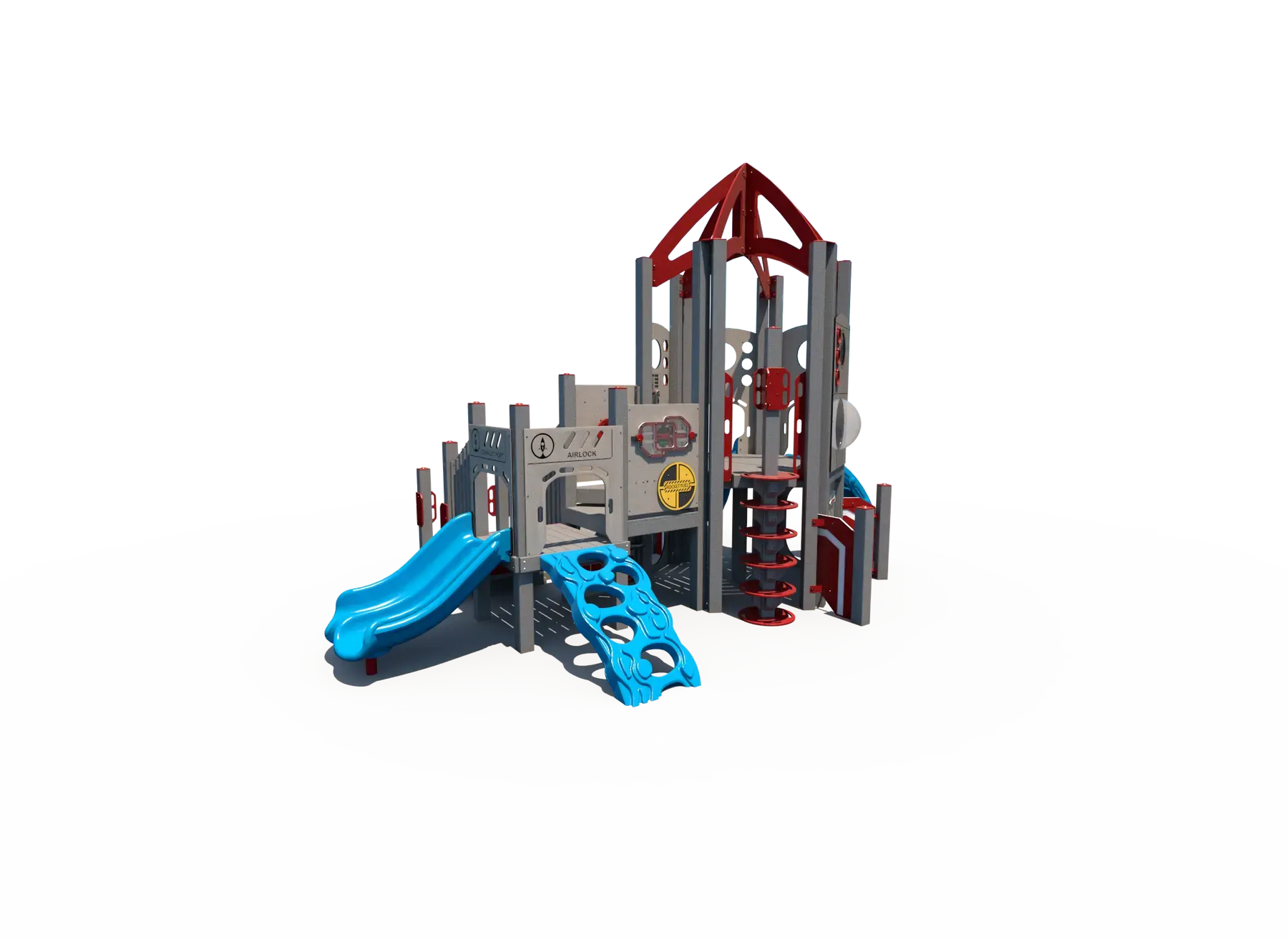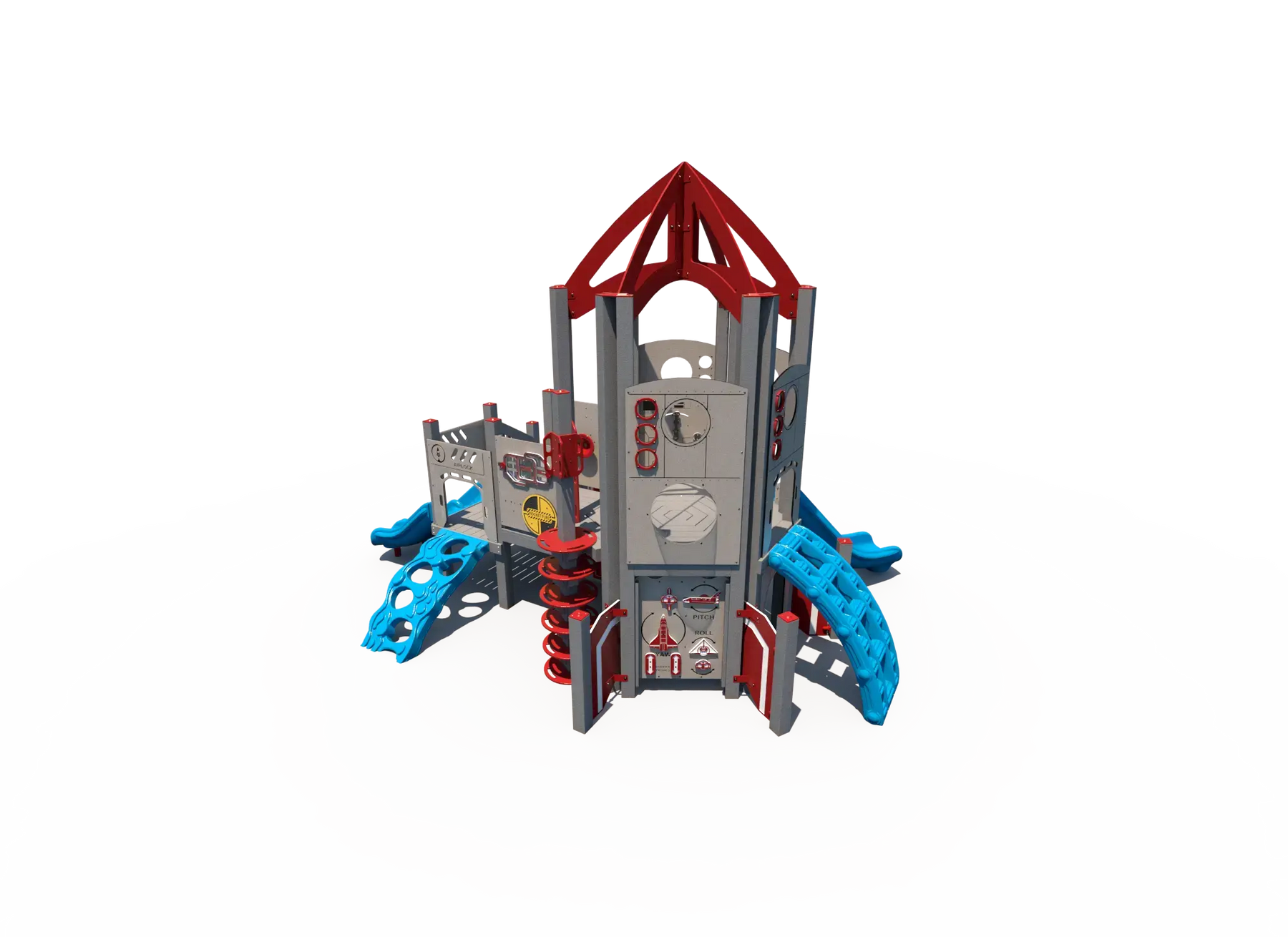 Children can climb, crawl, and slide through enclosed tube slides, astronaut-style crawl tunnels, and interactive play panels that support physical development, coordination, and imaginative role-play. Towering rocket fins and detailed space elements create a visually engaging environment that invites storytelling and cooperative play. Integrated shaded play areas help improve comfort and extend playtime in warmer climates. With multiple access points and varied play experiences, this playground accommodates a wide range of ages and abilities.