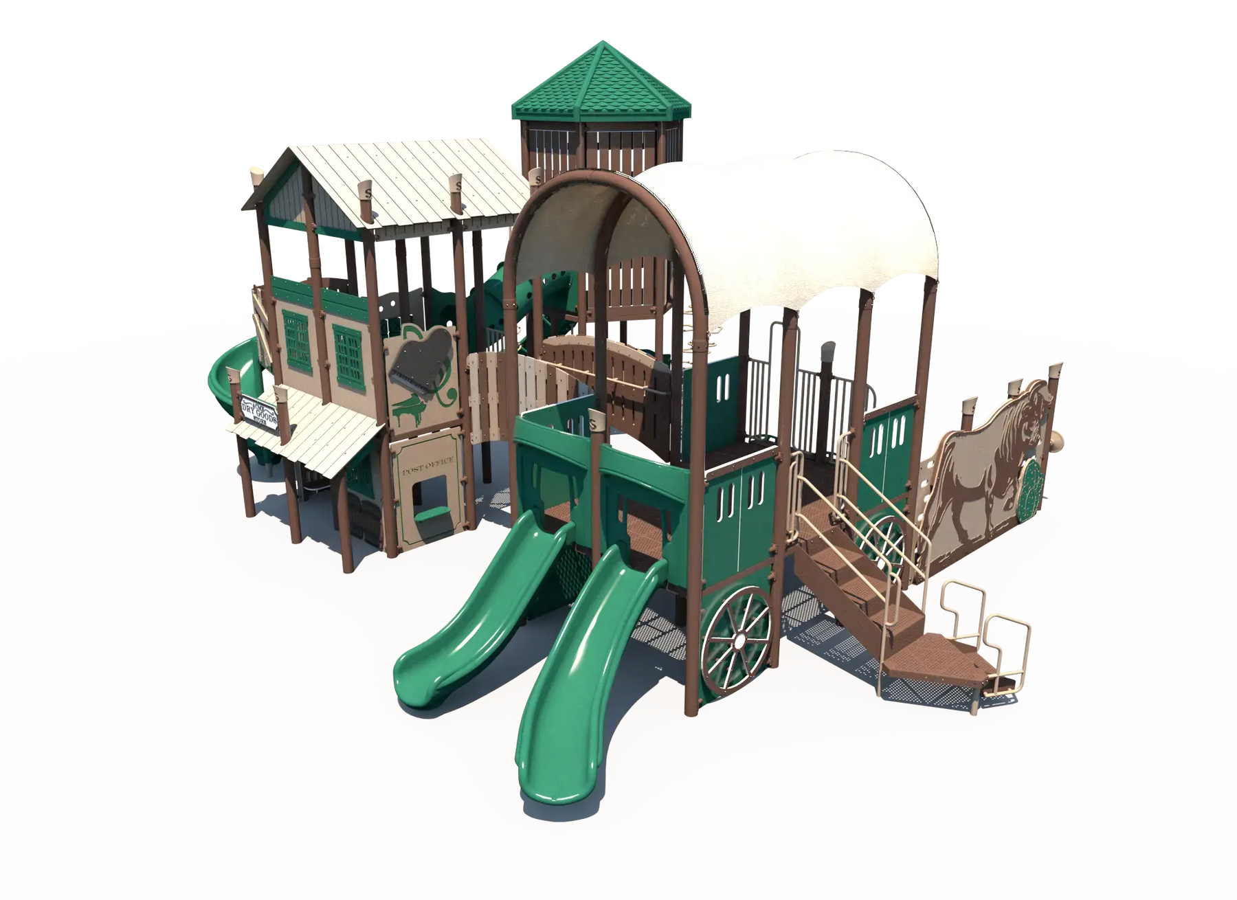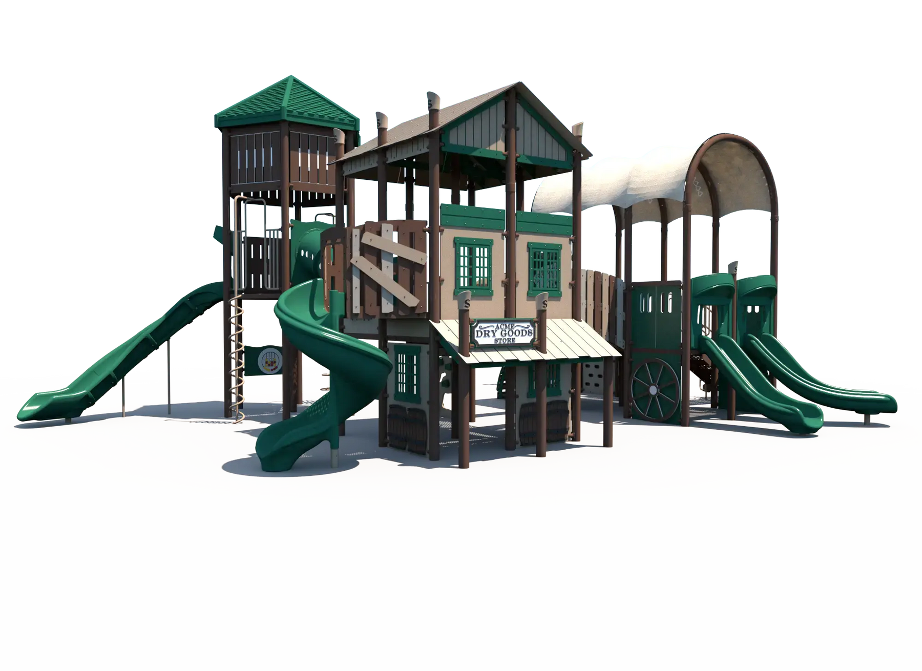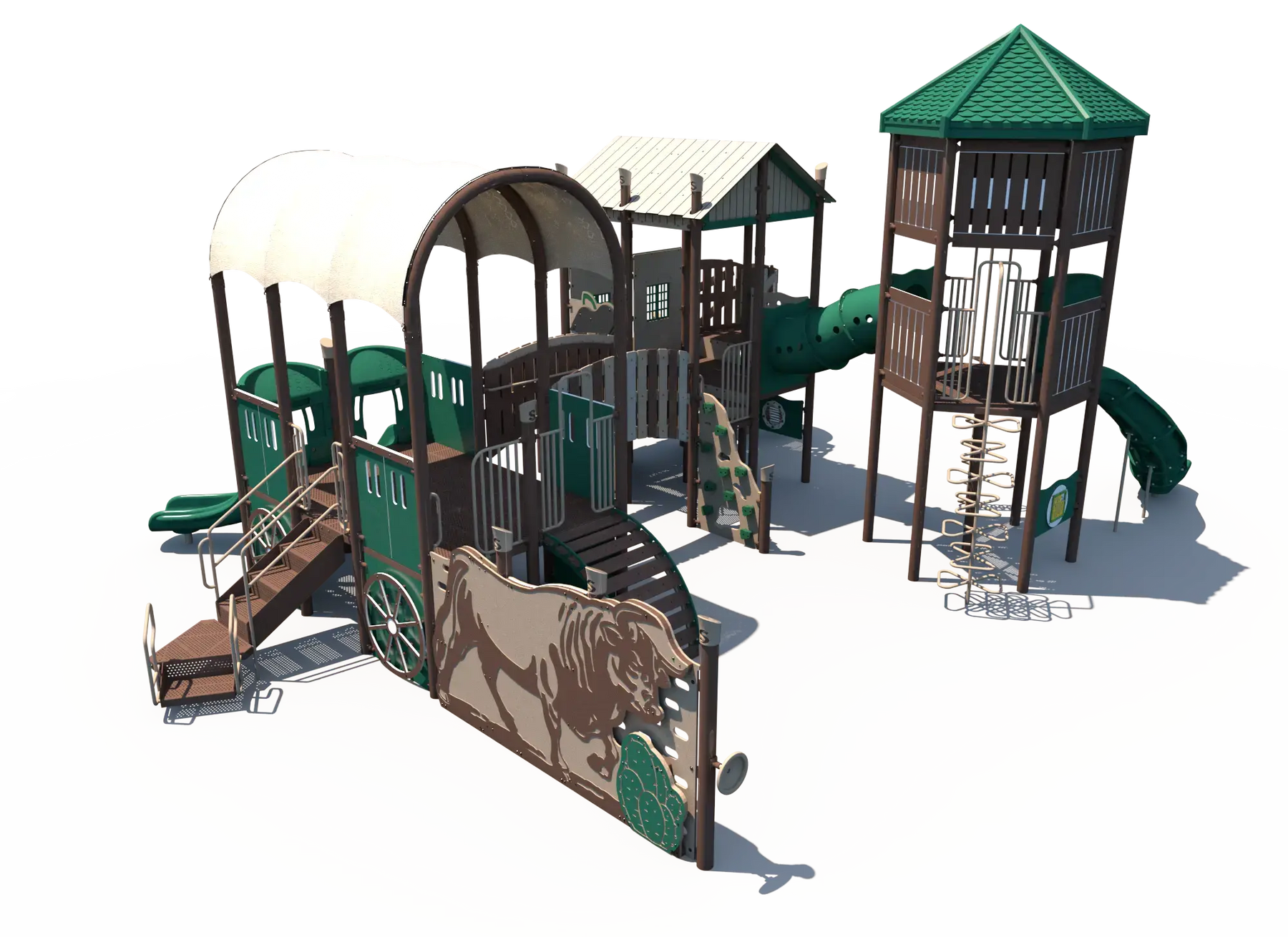 Inspired by the spirit of the Wild West, this playground encourages kids to create their own frontier adventures while exploring multiple play pathways throughout the structure. Children can build strength, balance, and coordination as they navigate climbers and elevated play areas, while exciting slides provide fast-paced movement play that encourages repeat exploration. Interactive panels add opportunities for imaginative role play and social interaction, helping children collaborate and create their own western town stories.
