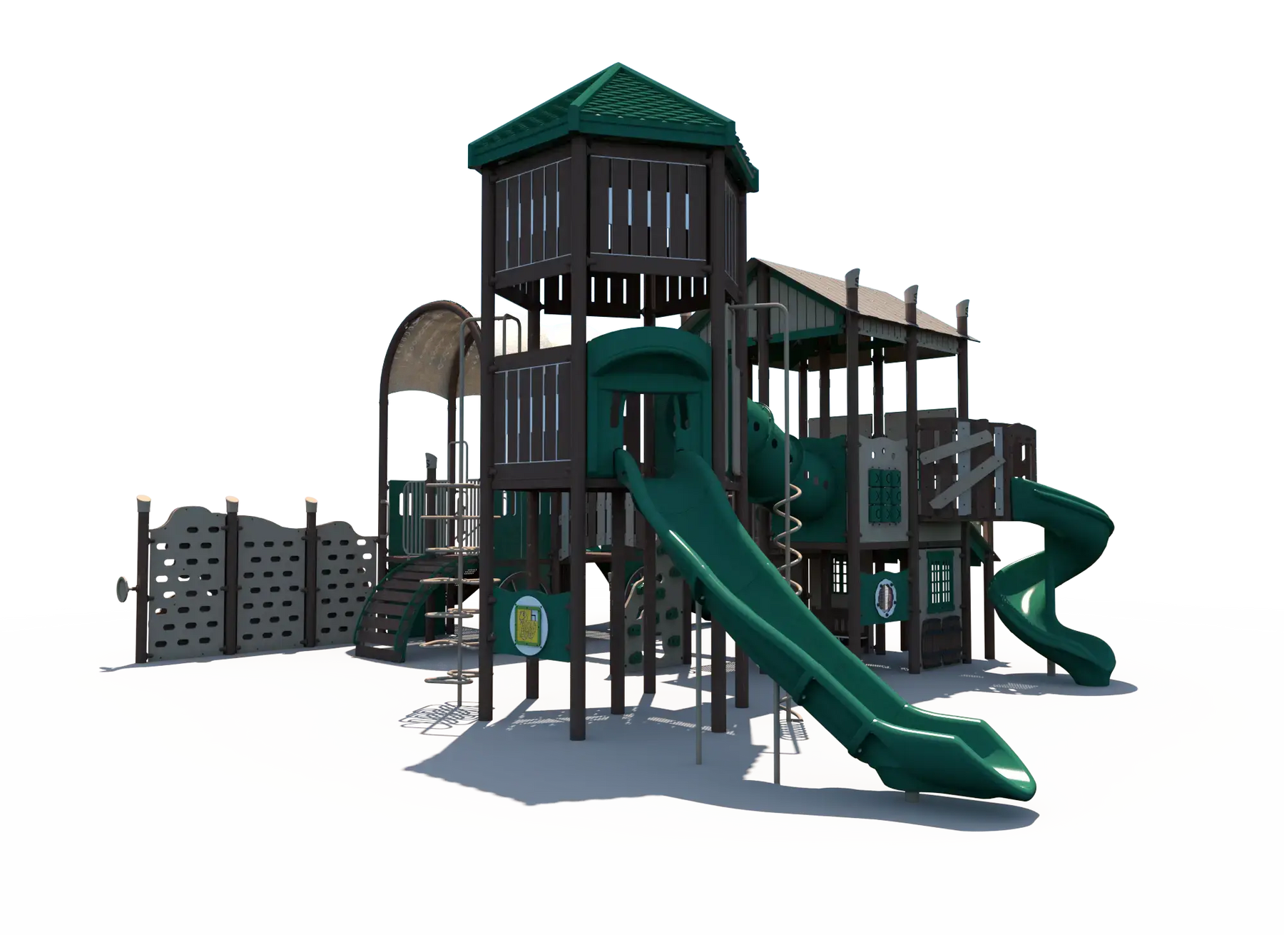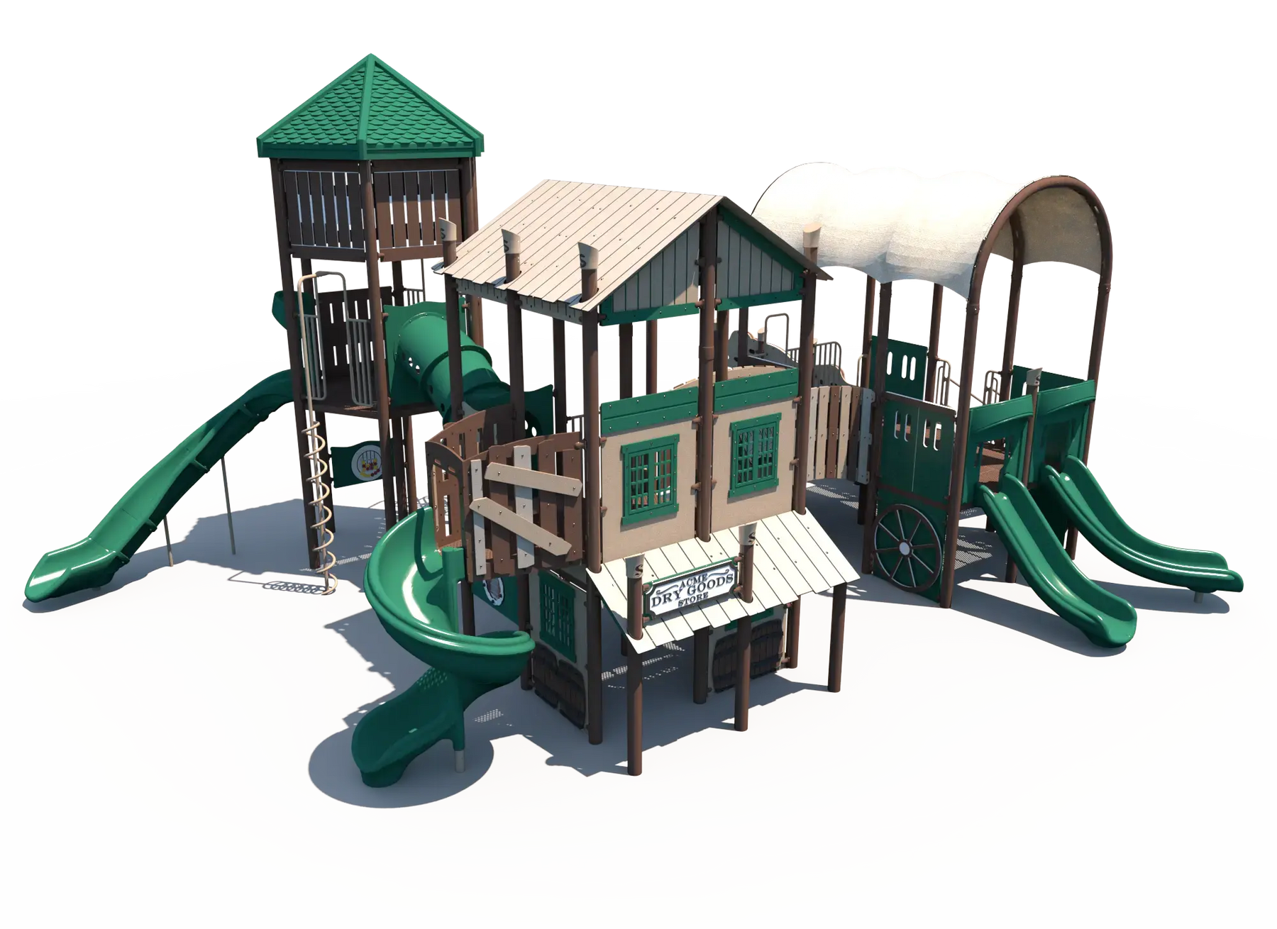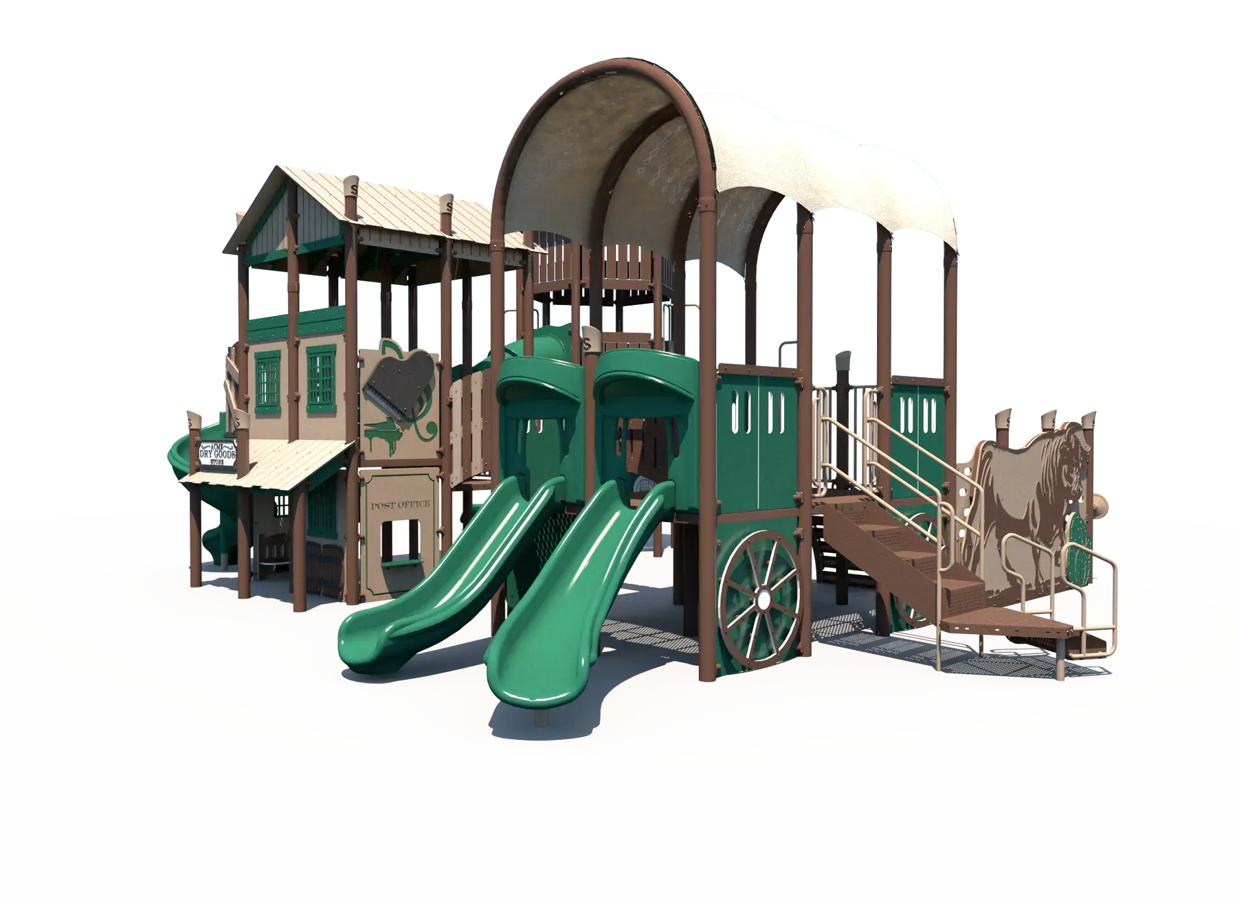 Inspired by the spirit of the Wild West, this playground encourages kids to create their own frontier adventures while exploring multiple play pathways throughout the structure. Children can build strength, balance, and coordination as they navigate climbers and elevated play areas, while exciting slides provide fast-paced movement play that encourages repeat exploration. Interactive panels add opportunities for imaginative role play and social interaction, helping children collaborate and create their own western town stories.