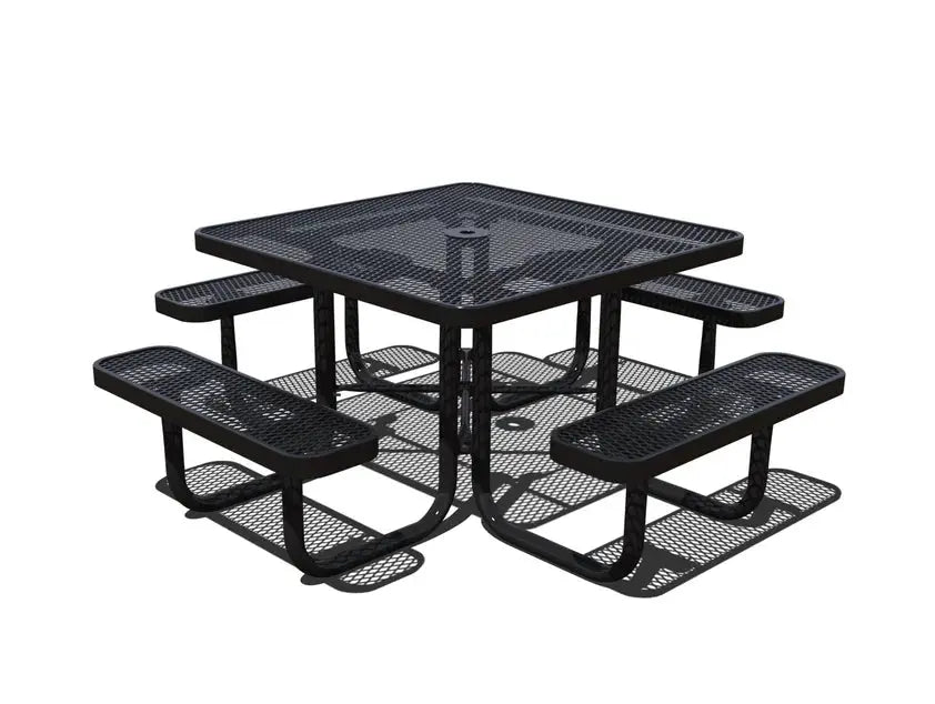 Constructed with a 1 5/8″ black powder-coated steel frame, the UltraLeisure Square Portable Table offers dependable strength for everyday outdoor use. The expanded metal design, combined with glossy thermoplastic tabletop and seats, provides durability while maintaining a simple, versatile appearance. Available in three- or four-seat configurations, the table adapts easily to a variety of site layouts. A center umbrella hole adds functionality for shaded seating, and pre-drilled surface mount holes allow for optional anchoring.