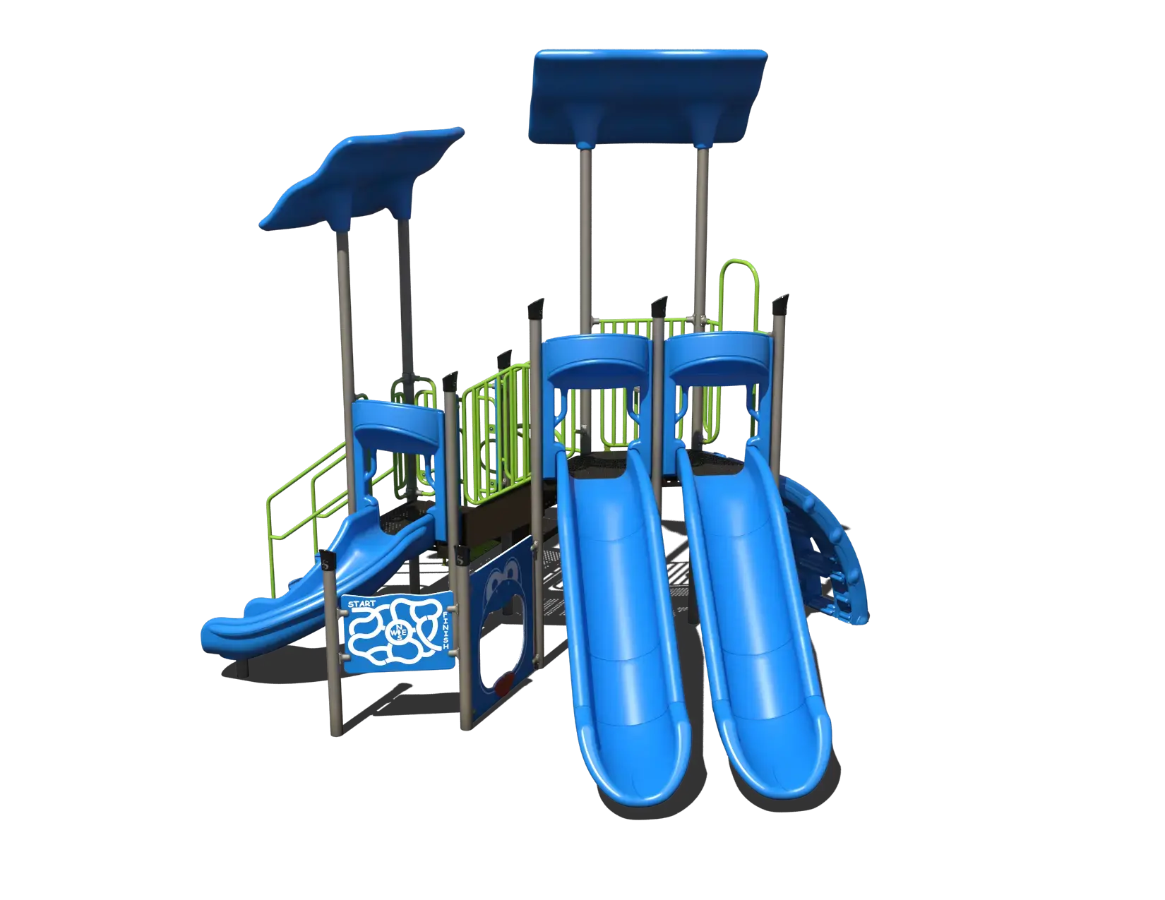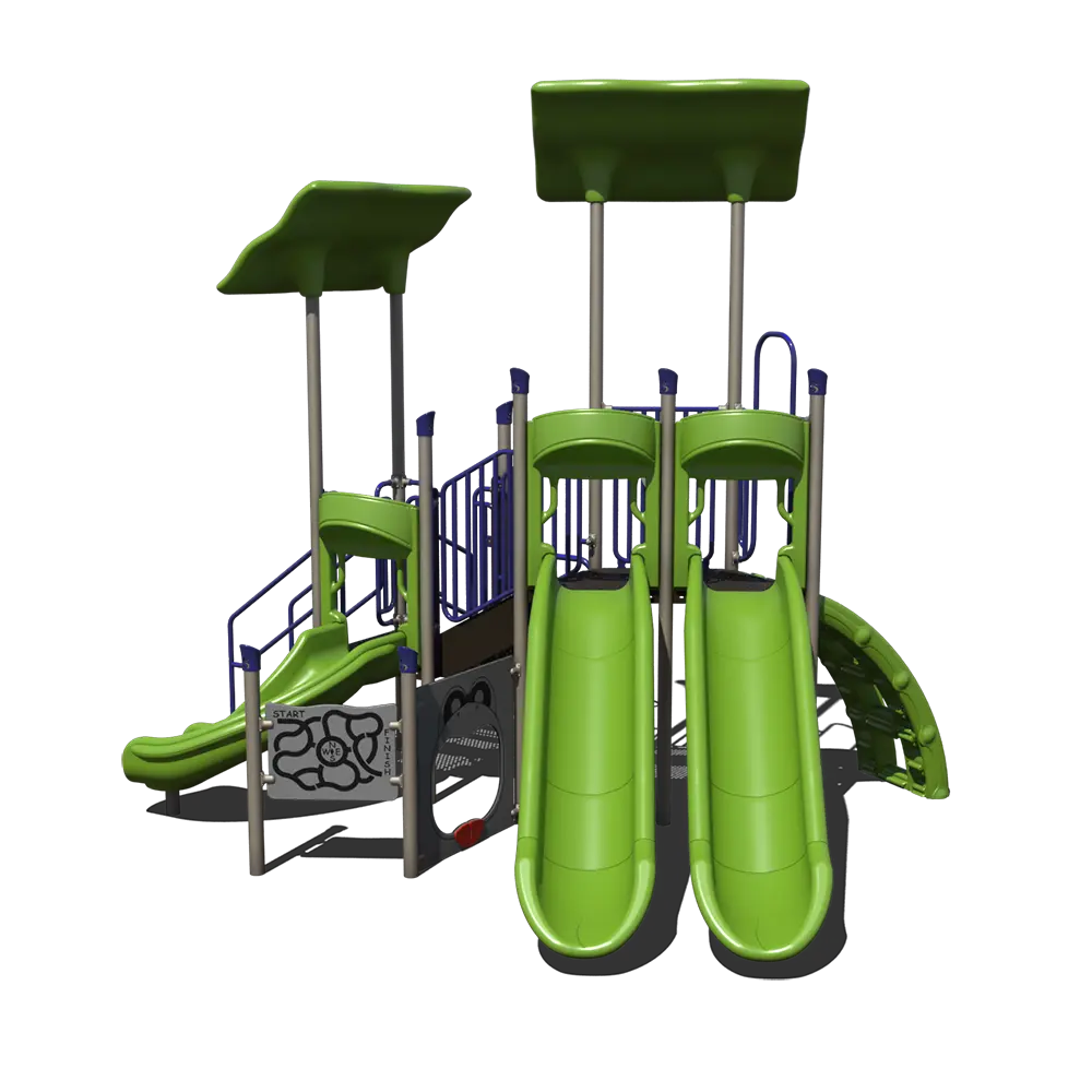 With three slides as its main attraction, the PS3-71308 encourages repeated play while supporting gross motor development, coordination, and confidence. Children can access the elevated decks using two climbers or traditional stairs, allowing varying skill levels to participate comfortably. Deck-level and ground-level activity panels add sensory and social play opportunities, supporting cognitive development and cooperative interaction. A maximum fall height of just 5 feet makes this playground especially appropriate for mixed-age environments.