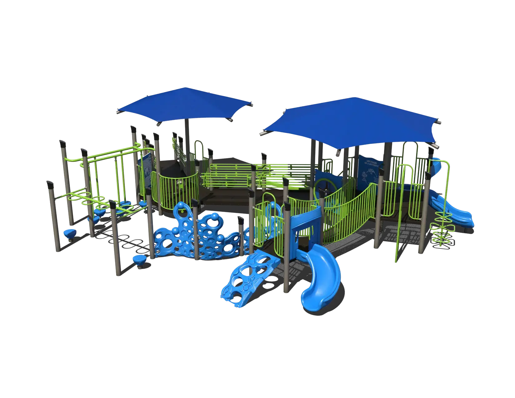 Discovery Inclusive Playground is a large-scale inclusive playground system designed specifically for early childhood play, supporting children ages 2–5 with accessible, developmentally appropriate features. With an integrated ADA-accessible ramp network, multiple shaded platforms, and low-height activity elements, this system creates a safe and engaging environment where young children of all abilities can explore together.