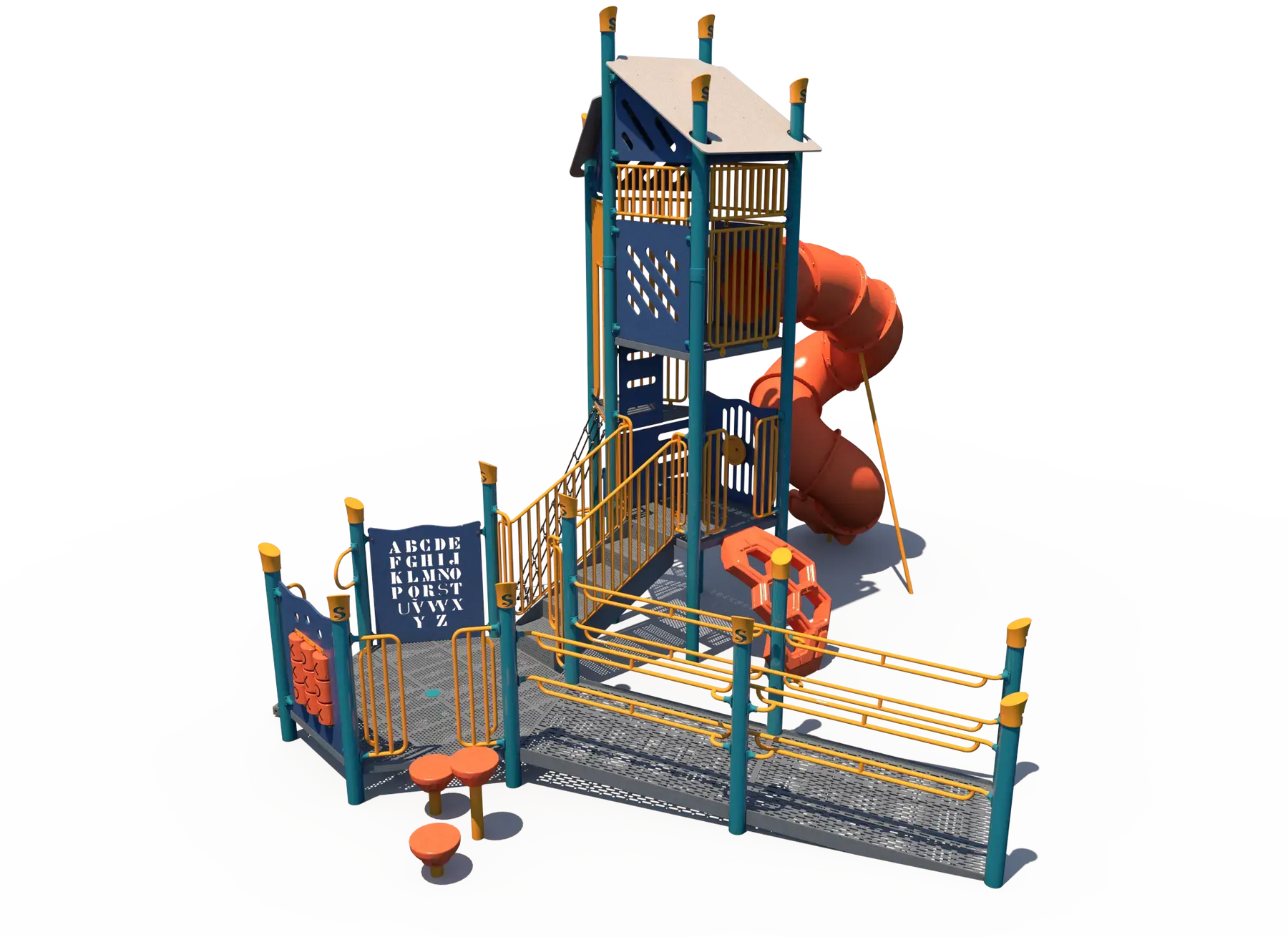 The integrated ramp leads to deck-level play panels, creating opportunities for children of all abilities to explore, interact, and play together. Interactive activities support sensory engagement, imaginative play, and social interaction while the tower design encourages climbing, exploration, and active movement throughout the structure.