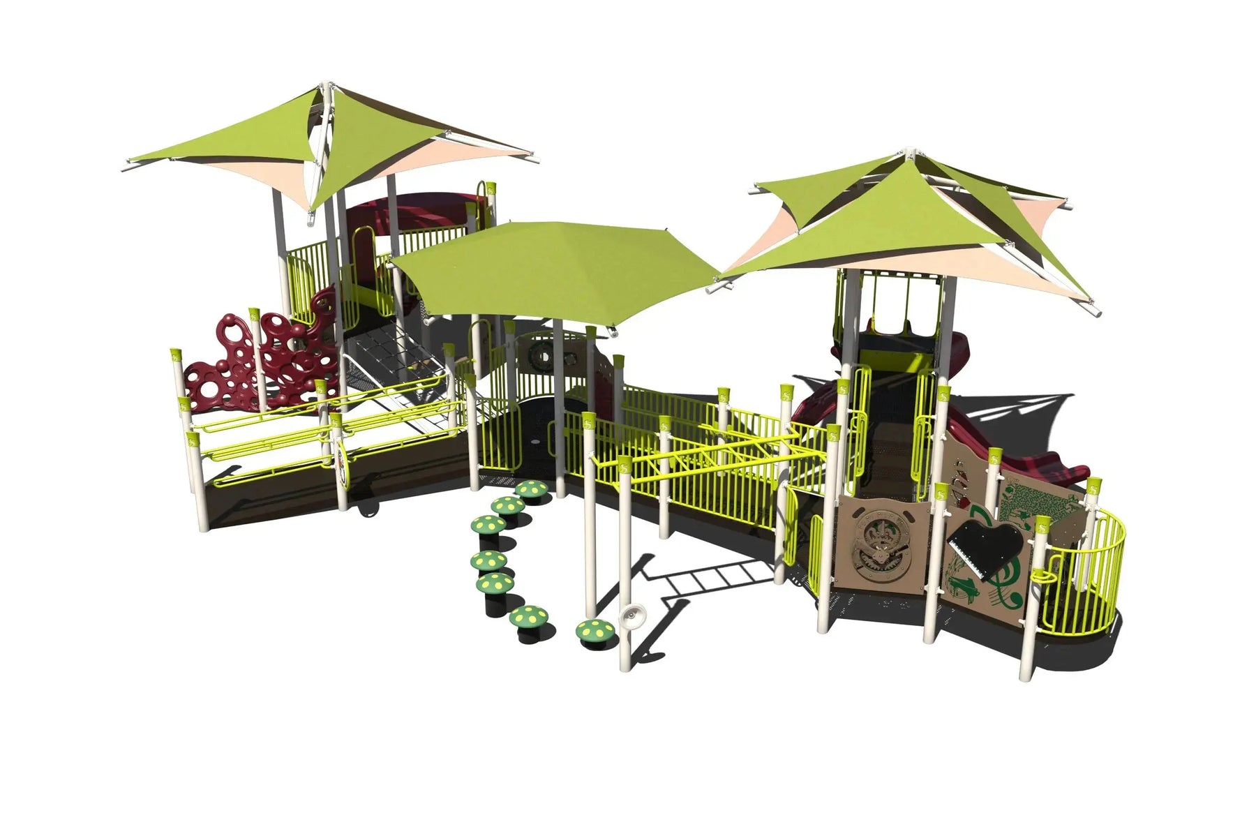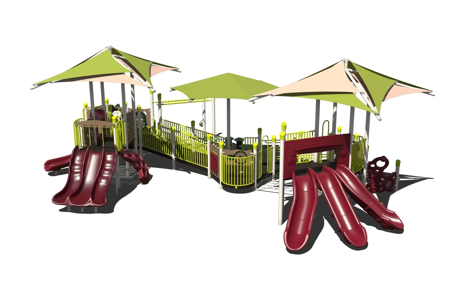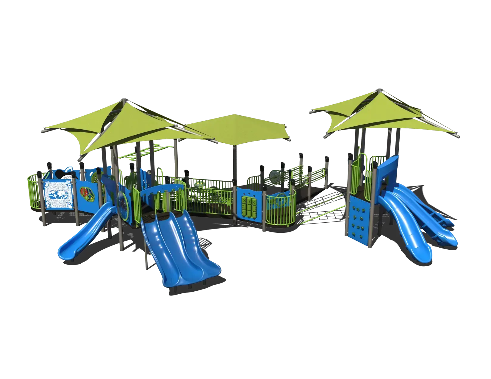 A continuous ramp system provides access to elevated play areas, allowing children of varying abilities to explore the structure together. Seven slide bedways, numerous activity panels, and a wide range of balance and climbing elements encourage strength, coordination, problem-solving, and social interaction. Elevated pathways and interconnected play zones promote continuous movement and repeat play while supporting cooperative and imaginative experiences.