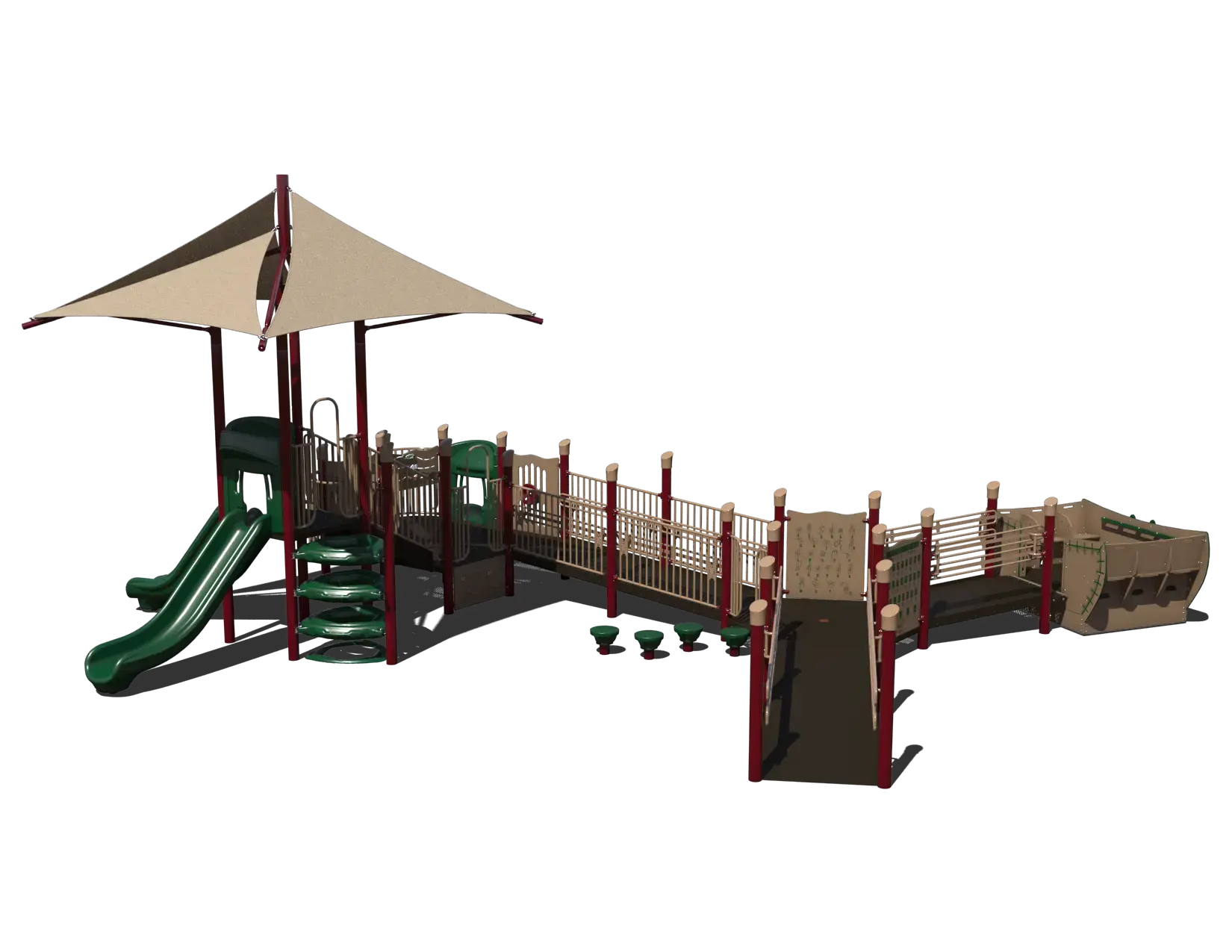 A wide, continuous accessible ramp flows throughout the structure, providing confident access for children using mobility devices while supporting caregivers and inclusive supervision. This thoughtful circulation allows children to move freely between elevated play components without barriers. The most distinctive feature of the Harmony Haven is the integrated Rockin’ Glide, a cooperative motion-based play element that seats six children and includes dedicated space for one mobility device. This shared activity encourages communication, teamwork, and social interaction, reinforcing inclusive play through group movement.