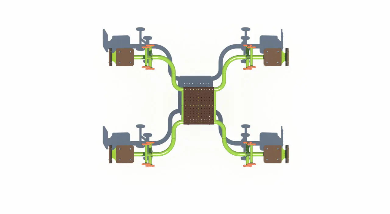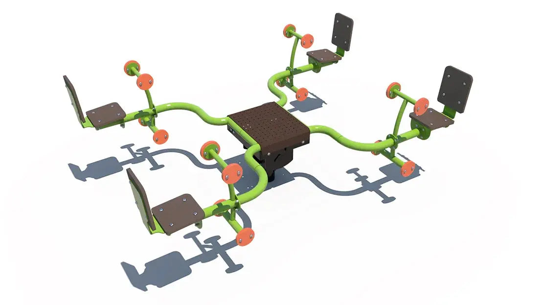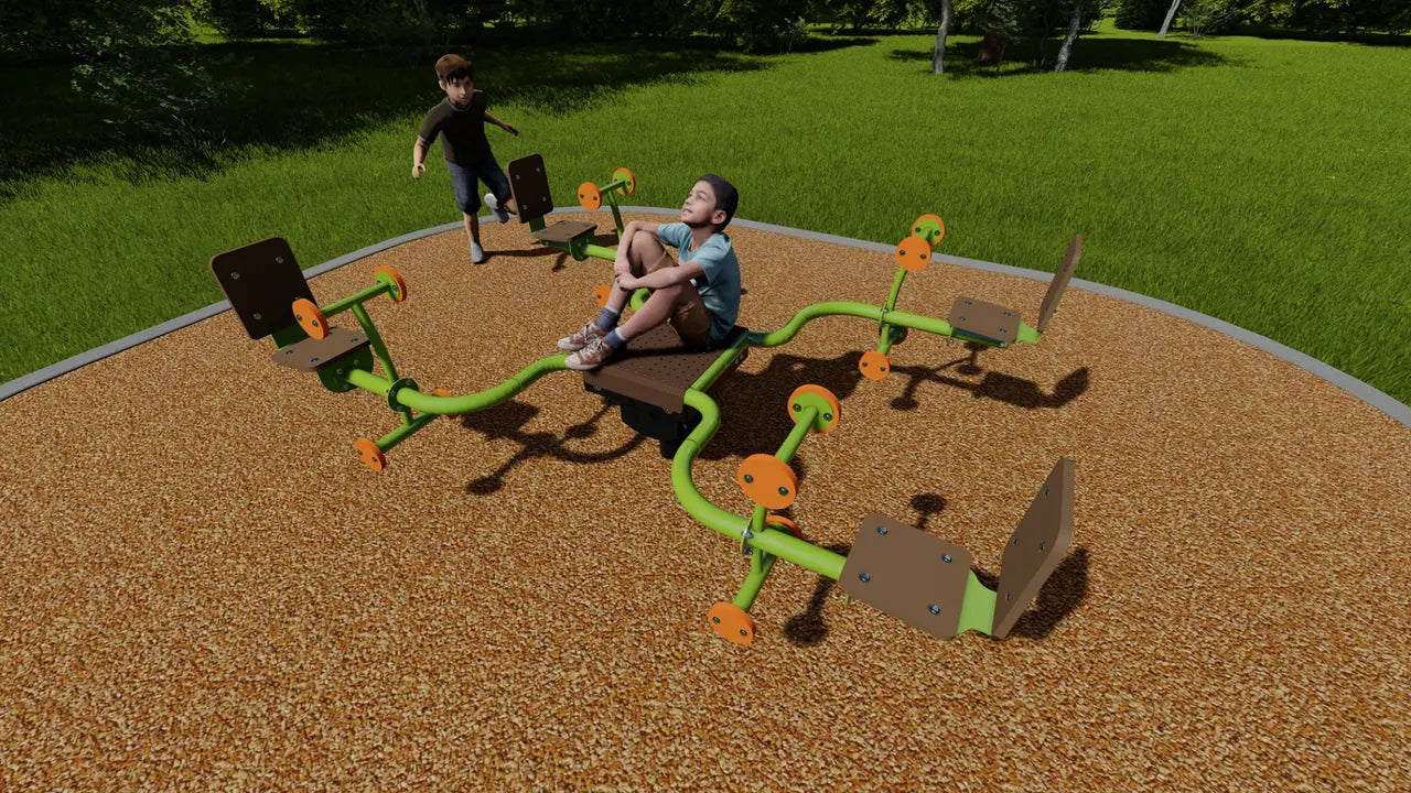 The Quad Saw features a central platform with four seating positions, allowing multiple children to play together at once. As children rock and balance, they build core strength, coordination, and timing while learning to work together to create movement. This group-oriented design naturally supports communication, turn-taking, and social development. Its compact footprint makes it easy to incorporate into a variety of playground layouts without overwhelming the space.