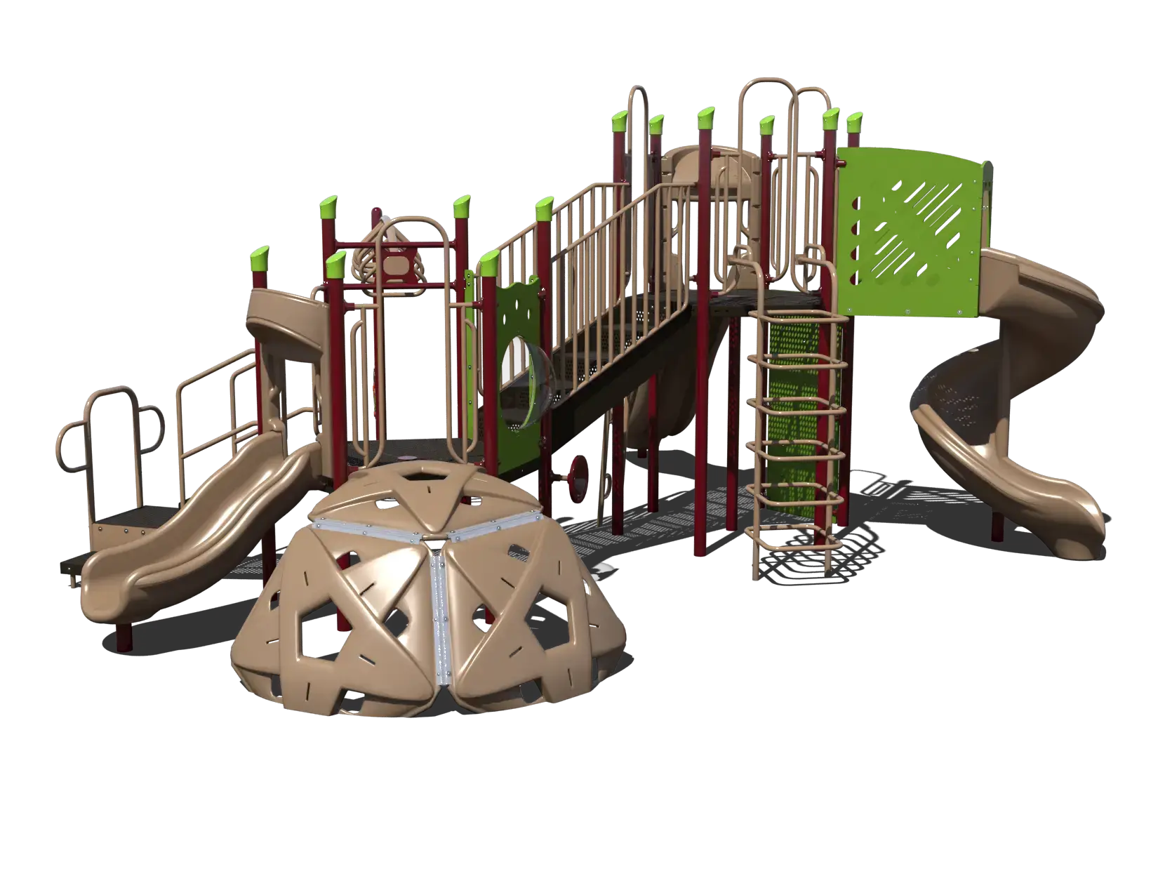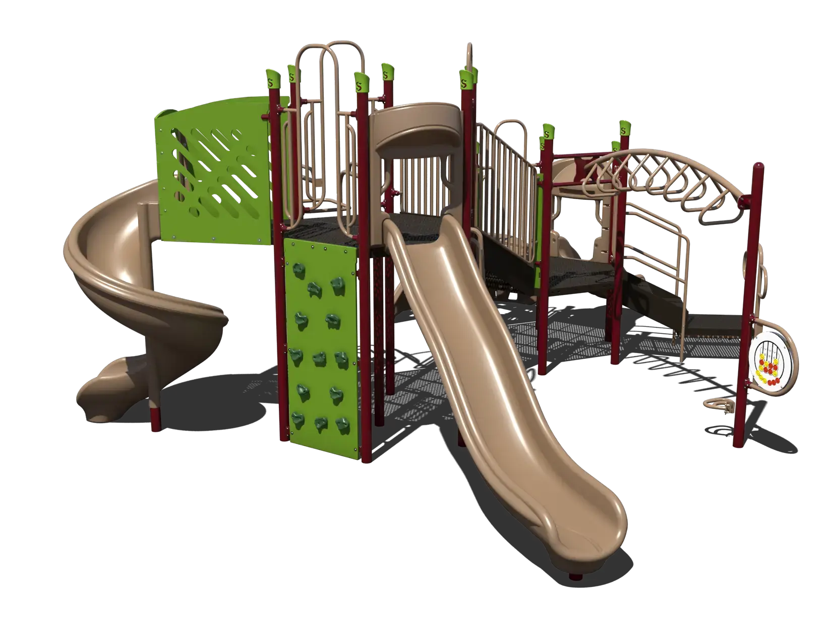 Turn your outdoor space into a destination for big-kid excitement with the Cedar Crest Adventure Spiral, a dynamic commercial playground designed for ages 5–12. Featuring a warm nature-inspired palette of tan, burgundy, and lime green, this structure blends natural tones with playful pops of color — perfect for parks, schools, neighborhoods, and recreation areas that want a modern yet organic aesthetic.