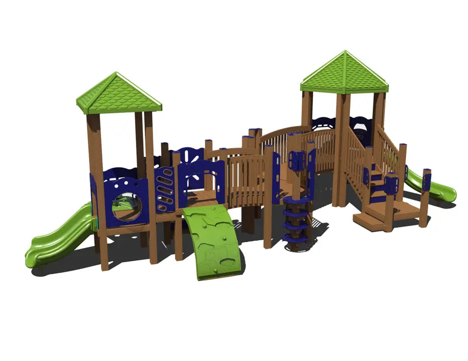 Designed for children ages 2–12, this playground supports active, imaginative, and social play while accommodating high user capacity. It is well suited for schools, parks, municipalities, churches, and community spaces seeking an environmentally responsible playground solution. The recycled materials resist corrosion, rot, cracking, insects, and environmental exposure, making this structure ideal for long-term outdoor use.