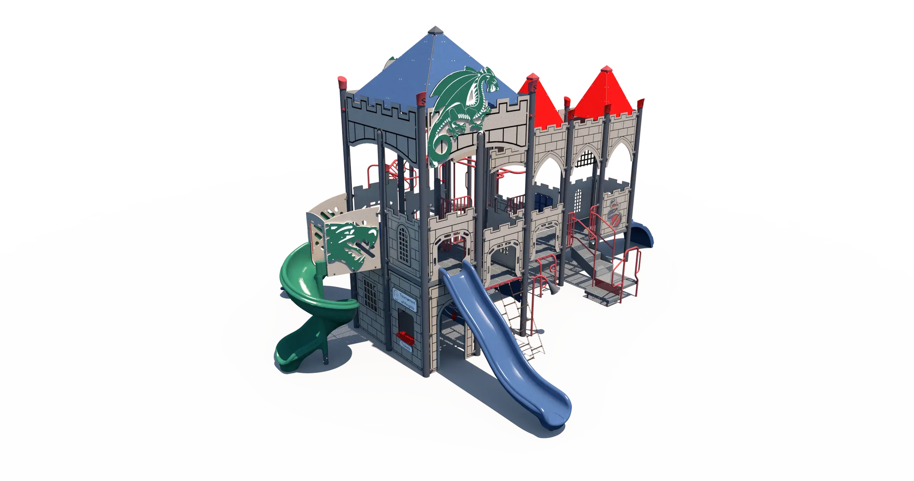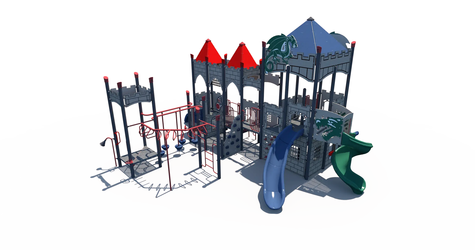 Castle-style walls and dragon-themed details create an immersive environment that encourages role play and imaginative exploration. Children can navigate a variety of climbers, slides, and interactive play panels, helping build strength, balance, and coordination while keeping them engaged in active outdoor play. Multiple play paths allow kids to explore different routes throughout the structure, promoting problem-solving and cooperative play with friends.